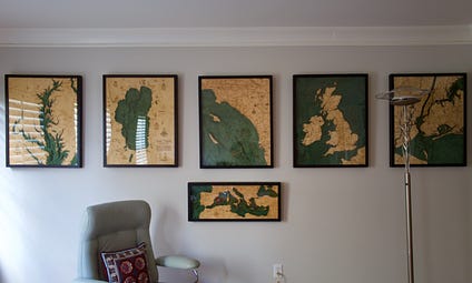 This is the wall in my living room. It’s opposite my desk, so it’s usually peeking out behind my head when I’m on video calls, which are more and more a part of my everyday life. This is essentially my trophy wall, a way to not-so-subtly brag about the big swims I’ve done: the Potomac River, Lake Tahoe, Catalina, the Strait of Gibraltar, the English Channel (and the North Channel), and the Manhattan 20 Bridges swim. The maps all come from a company called Woodchart Maps and I order them through a local retailer in the Mission, Aldea.