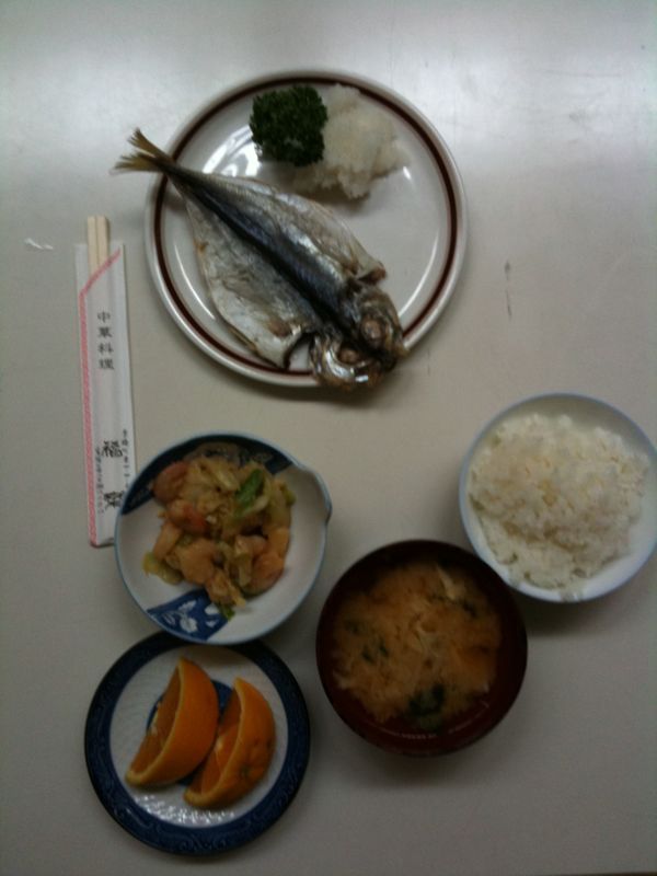Japanese meals are usually made up of lots of small portions. Today’s lunch included my very own mackerel. It looked up at me and said, “Please eat me, kind sir,” so of course, I did. It tasted great.
