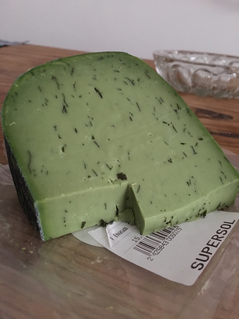 Yesterday on a whim, I picked up this pesto gouda cheese at the supermarket. Today I have tasted it and am pleased to report that it is AMAZING.