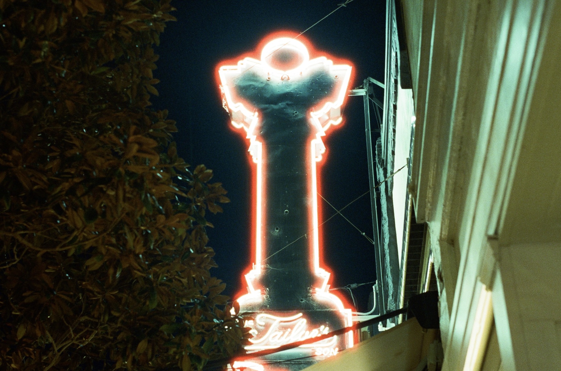 The Tailor’s Son is a good example of halation: the sign is a plain white, there is no red to it. But based on this photo, you’d think it had a lot of red.