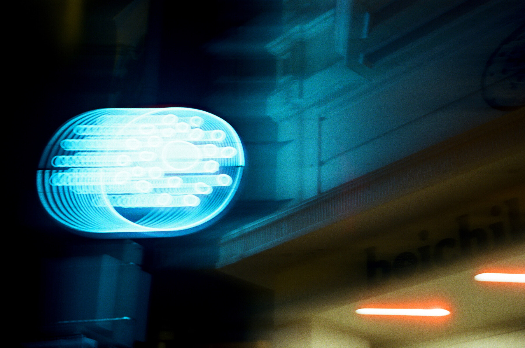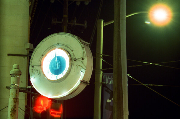 I used Cinestill 800T film, the T being for Tungsten. I knew that Cinestill is a processed version of movie film that allows it to use the more-typical C41 process, and one of the side effects is “halation”: halo effect around lights. Unfortunately, I didn’t put it together that, if my goal was to take pictures of lights, and this film stock has lots of artifacts around lights, that of course, I would end up with these artifacts.